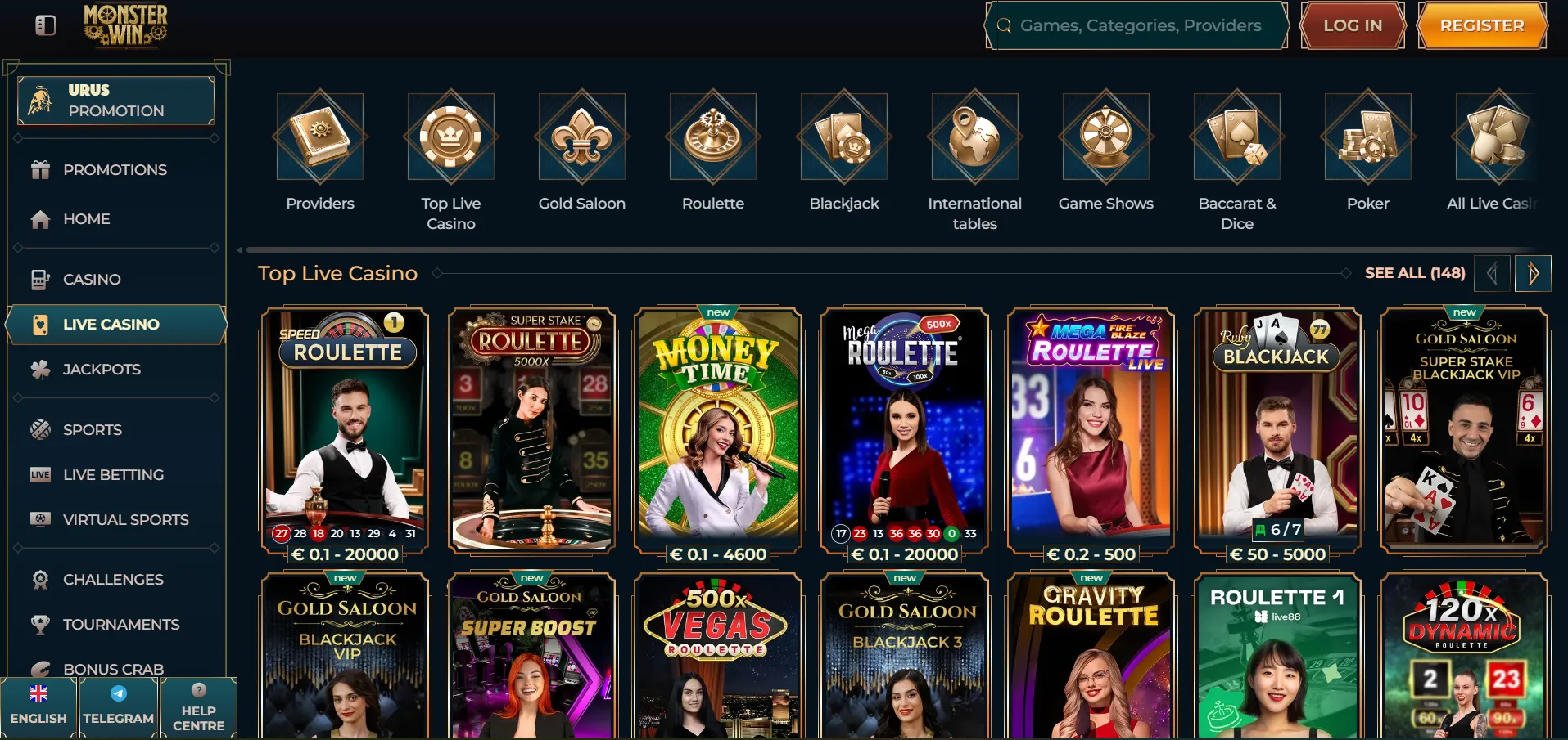 V Monsterwin online casino nas je najprej navdušila izjemno široka izbira vsebin, ki pokriva praktično vse vrste kazino zabave na enem mestu. Igralci lahko izbirajo med tisoči igralnih avtomatov, klasičnimi namiznimi igrami, interaktivnimi igrami v živo ter razvejanim sistemom športnih stav. Navigacija je zasnovana dinamično, dodatno pa iskalnik omogoča natančno filtriranje glede na funkcije, kot so megaways, bonus buy, progresivni jackpoti ali priljubljenost posameznih naslovov. V katalogu je več kot 10.000 iger vodilnih ponudnikov, med njimi Pragmatic Play, Evolution, Yggdrasil, Microgaming in NetEnt.